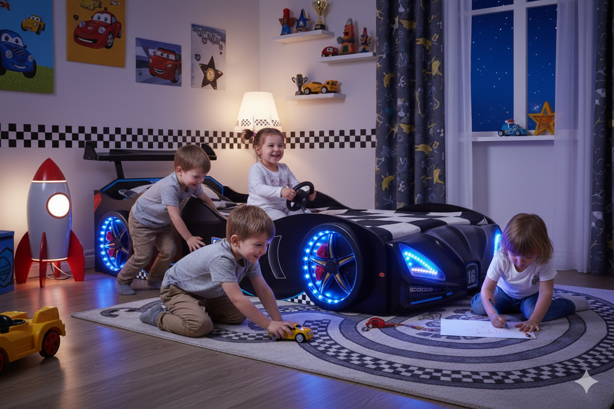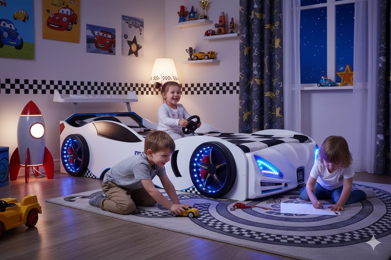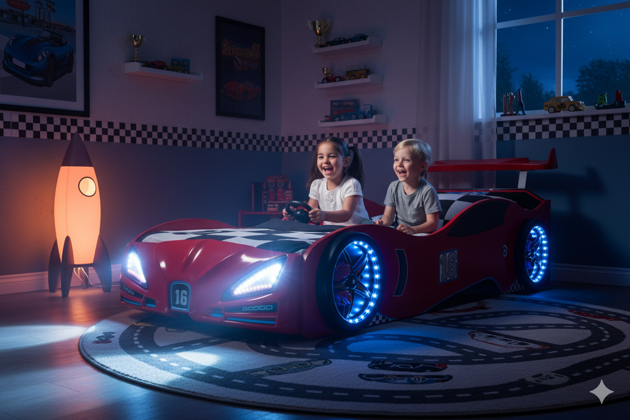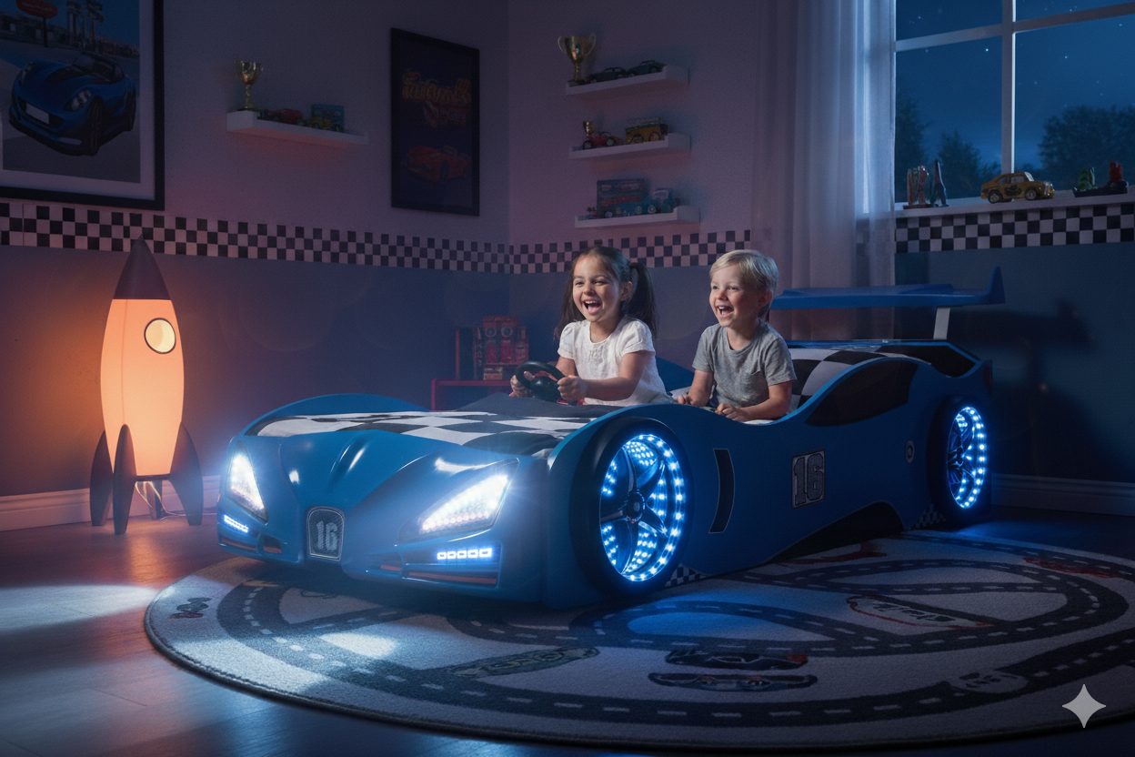 Verwandeln Sie das Kinderzimmer in eine aufregende Rennstrecke mit dem VERON XR-4 Autobett! Dieses Kinderbett in Form eines Autos ist nicht nur ein Hingucker, sondern bietet auch zahlreiche Funktionen, die kleine Rennfahrer begeistern werden. Das Bett ist ausgestattet mit Scheinwerfern mit LED-Beleuchtung und einem 12V Adapter, einer integrierten Soundbox im Frontbereich und Reifen aus ABS Kunststoff mit LED-Beleuchtung. Dank der Fernbedienung und dem sportlichen Spoiler wird jedes Zubettgehen zum Abenteuer. Die Liegefläche beträgt ca. 90 x 190 cm und die Gesamtmaße des Bettes sind ca. 105 x 80 x 205 cm (B/H/T). Das VERON XR-4 Autobett ist die perfekte Wahl für alle kleinen Autofans und bietet nicht nur einen Schlafplatz, sondern ein unvergessliches Spielerlebnis.