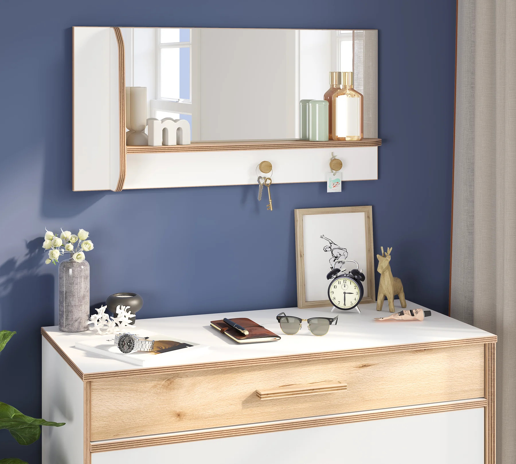 Ein echtes Multitalent für die Wand Das Besondere am Modera Spiegel ist seine Vielseitigkeit. Er verfügt über eine praktische Ablagefläche, auf der Parfüm, Deko oder Pflegeprodukte griffbereit platziert werden können. Zusätzlich bieten zwei integrierte Haken den perfekten Platz für Halsketten, Taschen oder Accessoires. So bleibt der Schreibtisch oder die Kommode frei von Kleinkram.