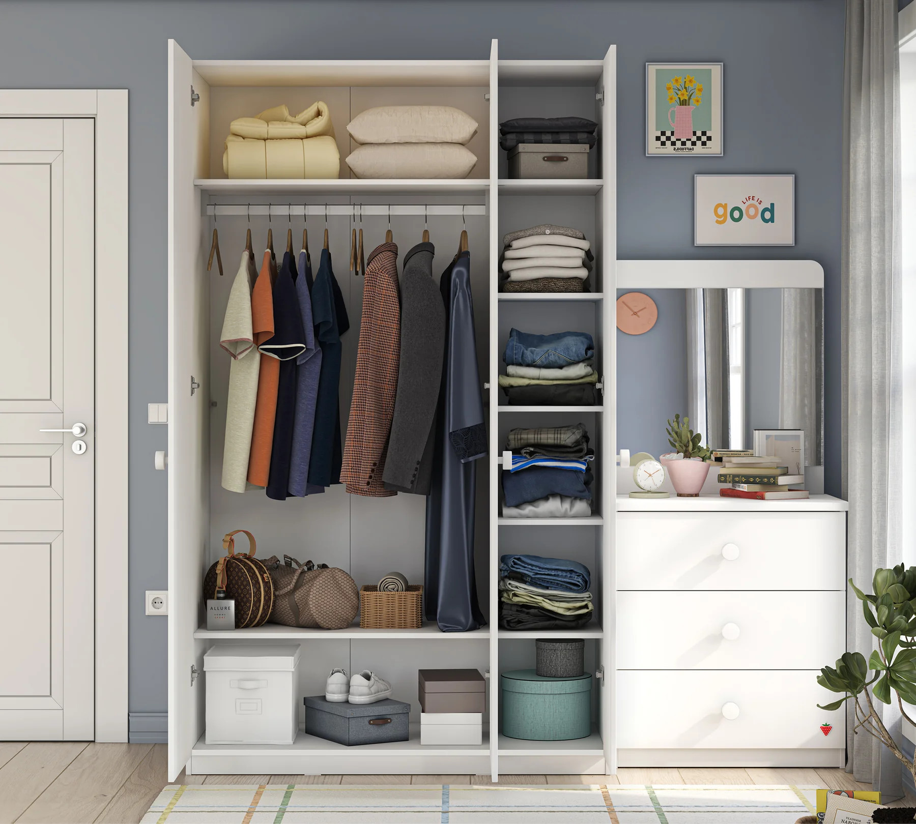 Vielseitiger Stauraum: Perfekter Mix aus Kleiderstange und vielen Regalfächern.