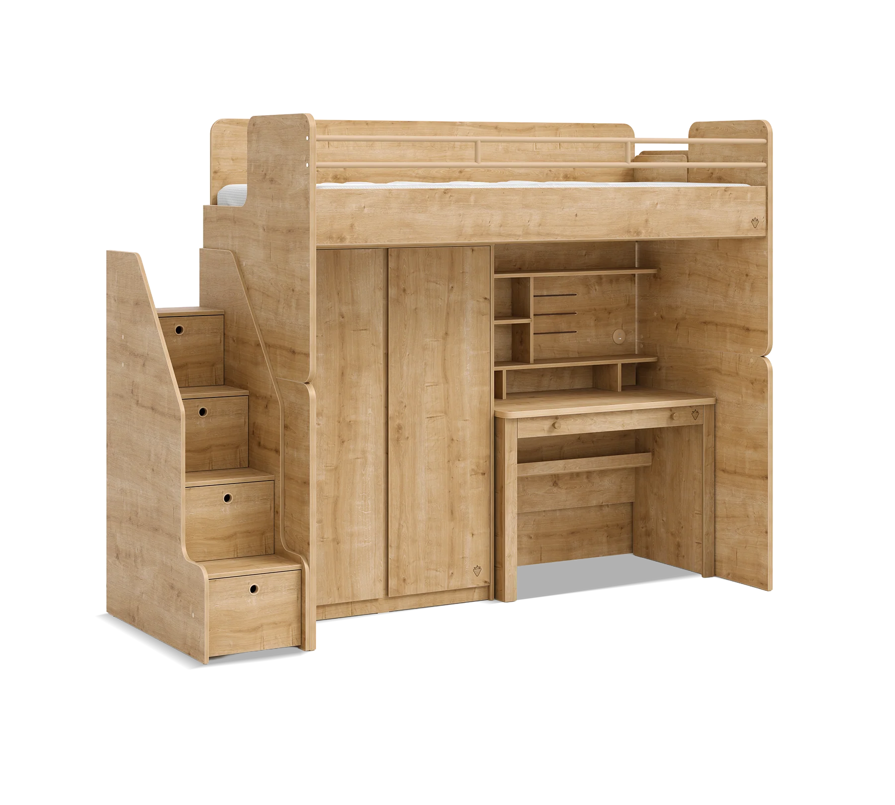 Durch die Kombination aus Untergestell, Oberbett, Schreibtisch, Kleiderschrank und Treppe entsteht dieses Hochbett aus der Studio-Kollektion von Cilek Möbel.