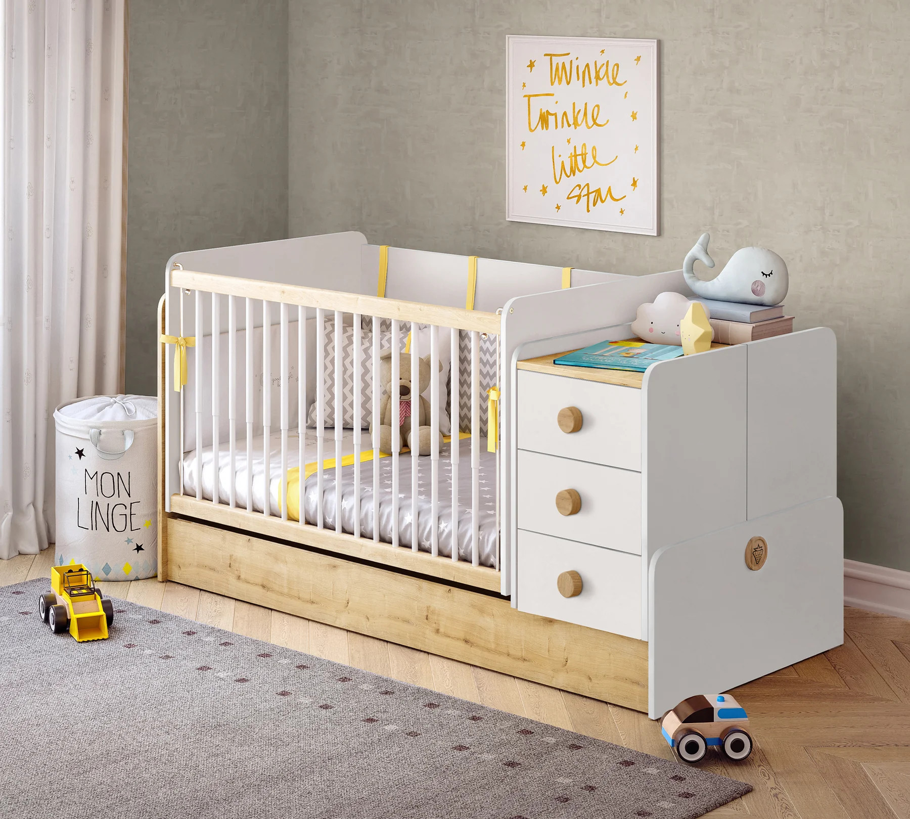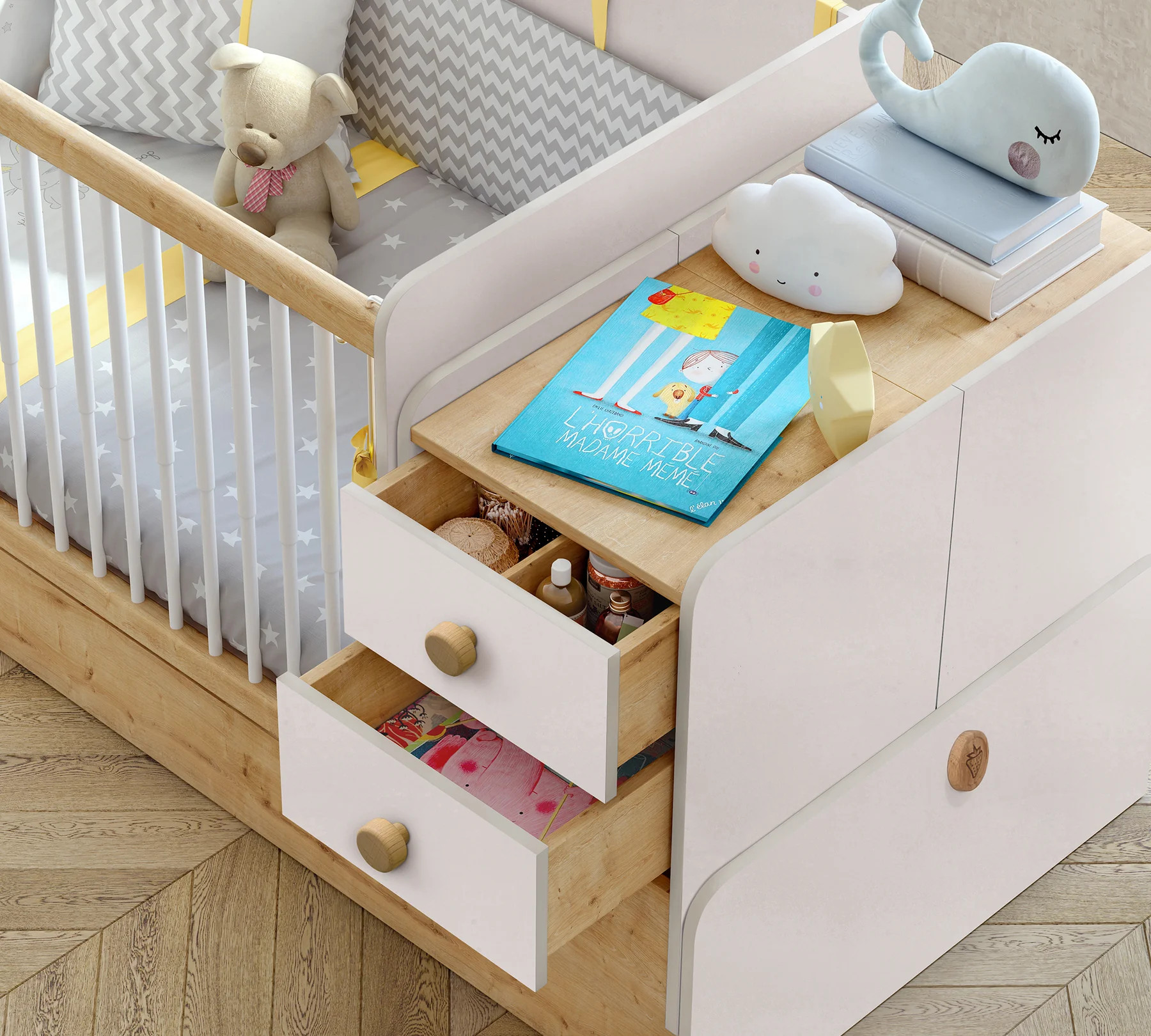 Nach dem Umbau verwandelt sich das Babybett in ein Kinderbett + Kindertisch + Kommode + Regal