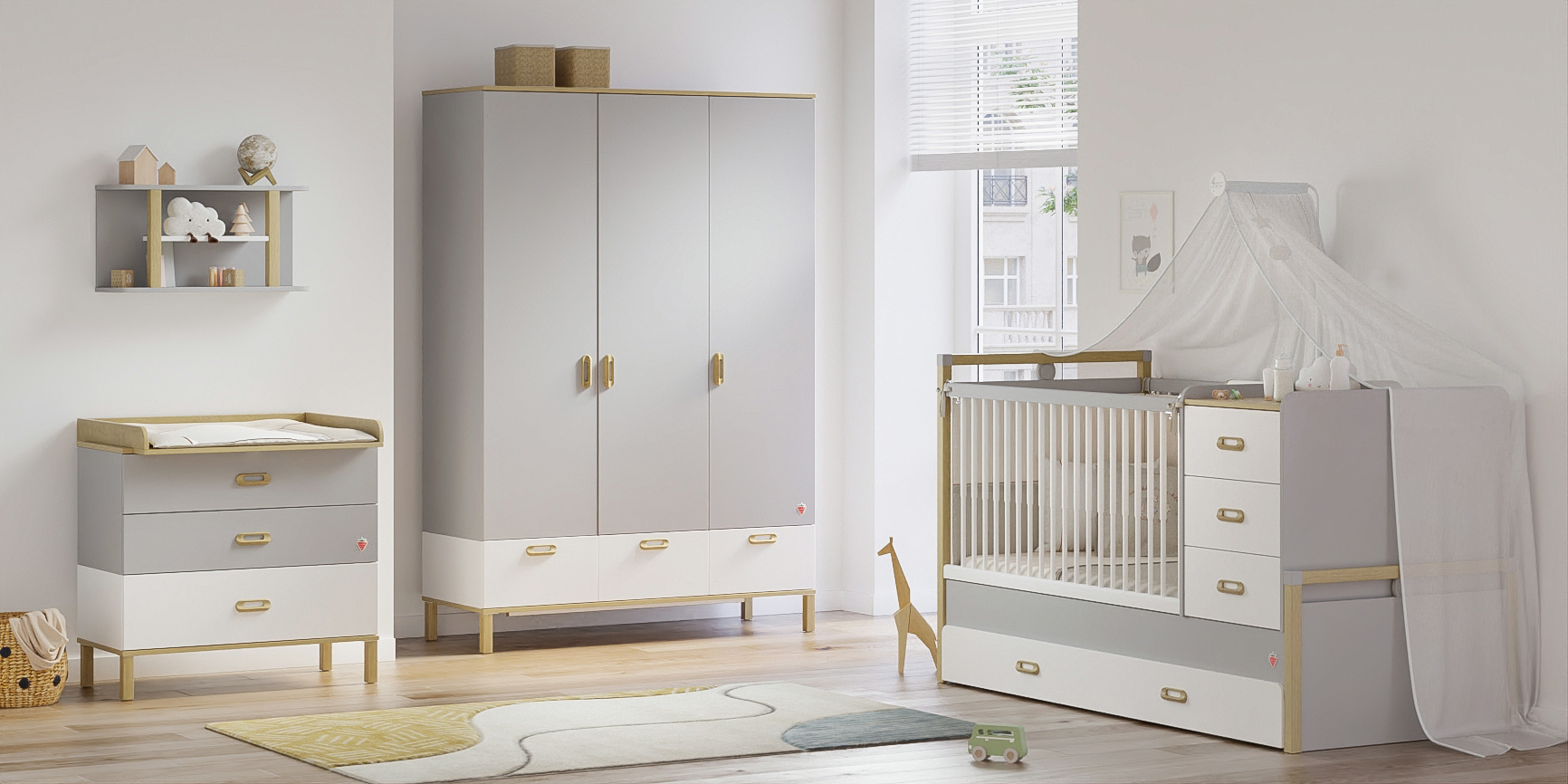 Babybett nach dem Umbau = Kinderbett + Bettkasten + Kommode + Regal