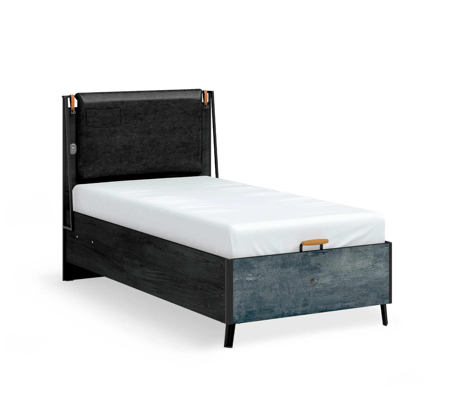 An alles gedacht: Im Kopfteil ist eine USB-Ladestation integriert, sodass Smartphone oder Tablet über Nacht bequem direkt am Bett geladen werden können. Zudem bieten praktische Seitentaschen am Kopfteil sowie ein dekorativer Reißverschluss Platz für Kleinigkeiten wie Ladekabel, Fernbedienung oder die Lieblingslektüre. Die markante Farbkombination aus dunklen Grautönen und tiefem Schwarz verleiht dem Raum eine coole, erwachsene Atmosphäre. Das absolute Highlight ist das handgefertigte Kopfteil aus hochwertigem Kunstleder. Mit seinen groben Nähten und dem Metallgestell setzt es optische Akzente, während die weiche Polsterung für maximalen Komfort beim Lesen oder Streamen sorgt.