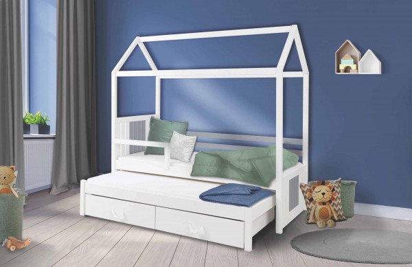 Kinderbett in Form eines Hauses wird aus hochwertigem Kiefernholz hergestellt. In dem Bett finden gleich zwei Kinder einen Platz. Das Bett wird inklusive zwei Matratzen und zwei Lattenrosten geliefert. Der Bettkasten bietet Platz für Bettwäsche oder Spielzeug an.