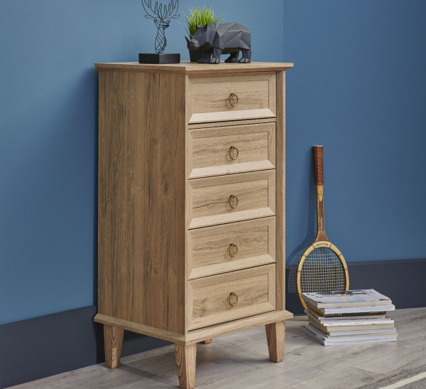 Diese Hochkommode PALERMO ist durch die schmale Größe ideal für kleinere Jugendzimmer in denen nicht viel Platz ist. Durch die hohe Höhe bietet die Kommode 5 Schubladen in denen vielerlei Gegenstände untergebracht werden können.
