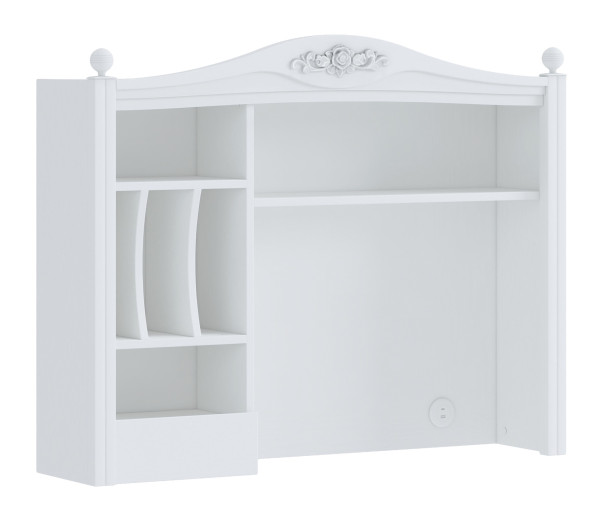 Der Schreibtisch-Aufsatz JASMIN ergänzt den Schreibtisch Jasmin perfekt und rundet den Arbeitsbereich gekonnt ab. Der Aufsatz ist in weiß gearbeitet und verfügt über ein langes sowie zwei kleinere waagerechte Regale und drei senkrechte Fächer. Passend zum Landhausstil ist der Kopf geschwungen gearbeitet und mit einem Blumenornament geschmückt.