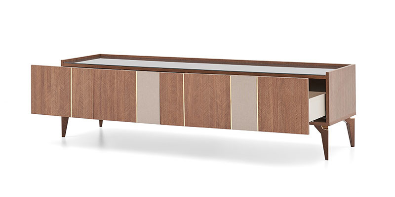 Das Lowboard LIKYA präsentiert sich in einer ansprechenden Eichenholzoptik in Kombination mit einer zarten Cremefarbe und goldenen Akzenten. Die vier modernen Füße verleihen dem Möbelstück Stabilität und einen trendigen Look. Mit einer großzügigen Schublade bietet die Kommode ausreichend Platz zur Aufbewahrung von Medienzubehör und anderen Utensilien. Die glänzende Ablagefläche bildet einen stilvollen Rahmen für deinen TV.